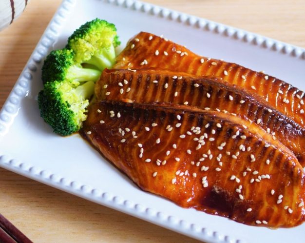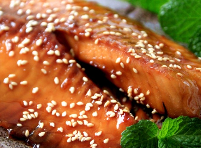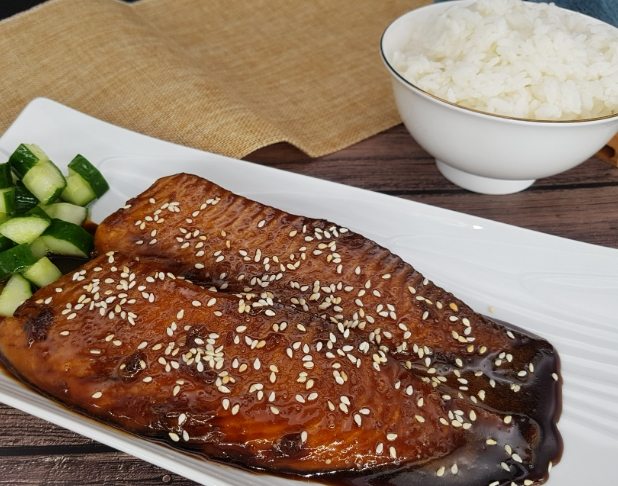 - 刷醬與炙燒:翻面(魚肉朝上),均勻刷上醬汁。溫度調高到 200度,烤 3分鐘。取出,再刷一次醬汁,放回去200度烤 2-3分鐘。重複刷醬烤的次數一樣是2-3次。